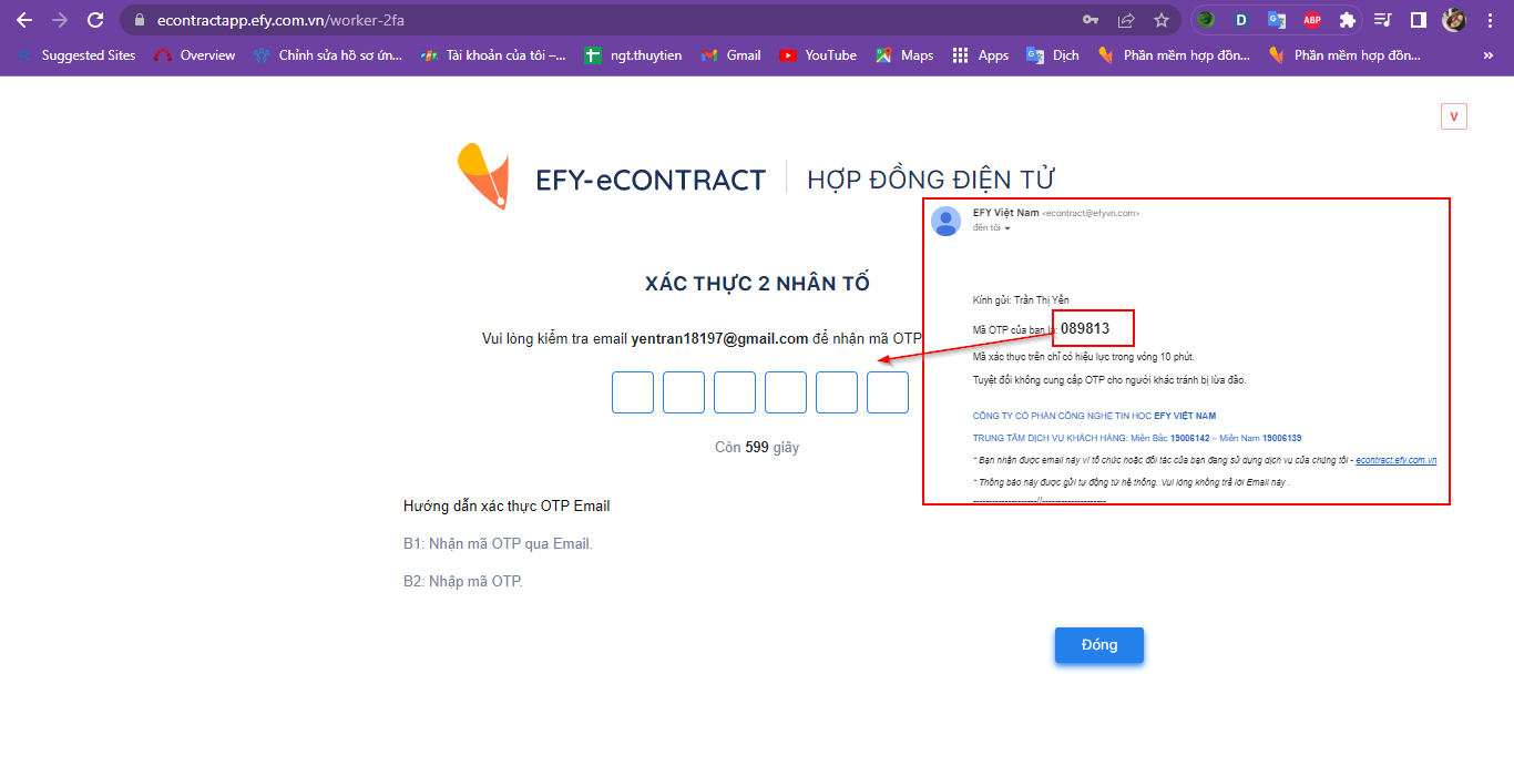 - Bước 3: Nếu đơn vị có cấu hình yêu cầu xác thực lớp thứ 2 bằng OTP, anh/chị nhập thêm OTP được gửi qua Email/SMS thông báo trên màn hình, nếu không yêu cầu 2FA thì NLĐ chuyển sang B4