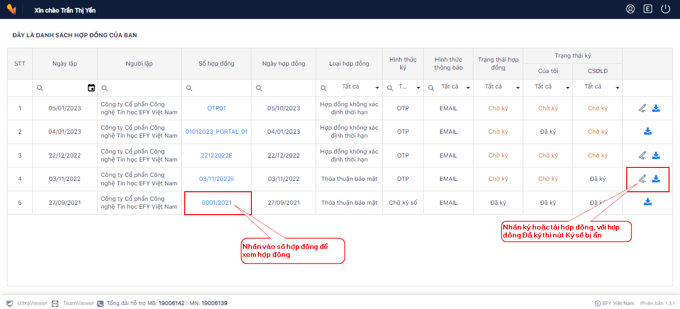 - Danh sách này bao gồm các HĐ đang chờ NLĐ ký, các HĐ đã được hoàn thành ký. - Tại đây, NLĐ có thể thực hiện xem HĐ, ký HĐ, tải HĐ có trong danh sách. - Với HĐ bị Hủy bỏ bởi CSDLĐ sẽ không hiển thị trong danh sách này.