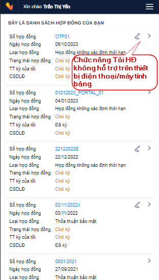 Chức năng Tải hợp đồng chỉ hỗ trợ khi NLĐ đăng nhập trên laptop/desktop, và chức năng Tải hợp đồng không hỗ trợ với thiết bị điện thoại